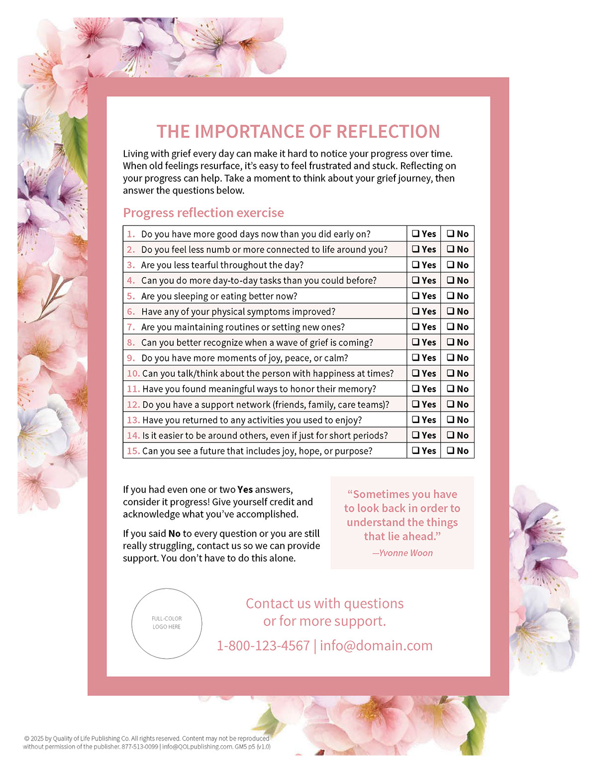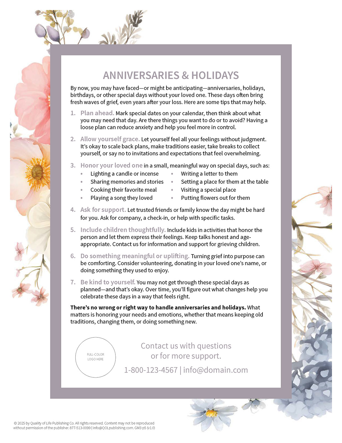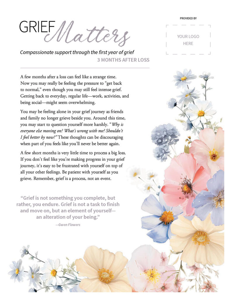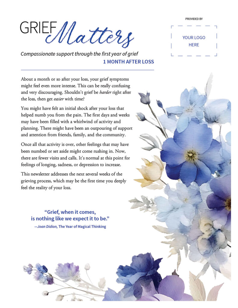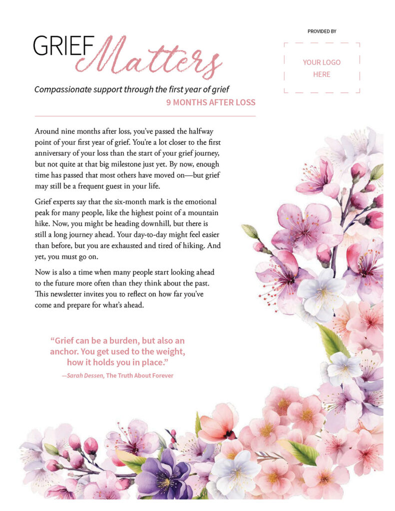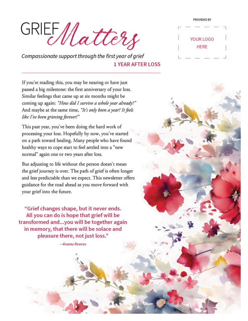 This 2-sided grief assessment sheet comes with every copy of the newsletter, branded with your logo, contact information, and spot color. Replace with your own assessment or opt out of receiving assessments by entering a note in Order Instructions or emailing us. |