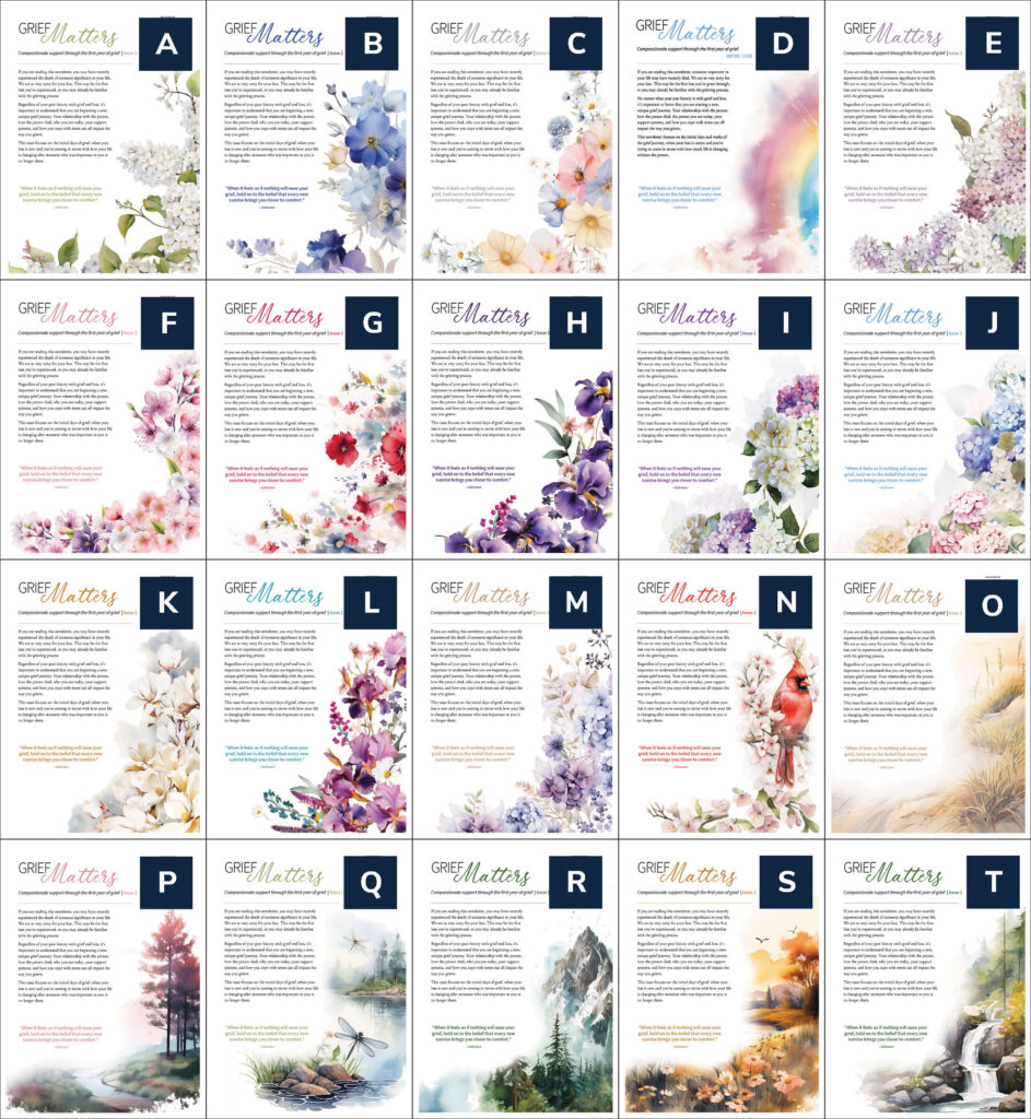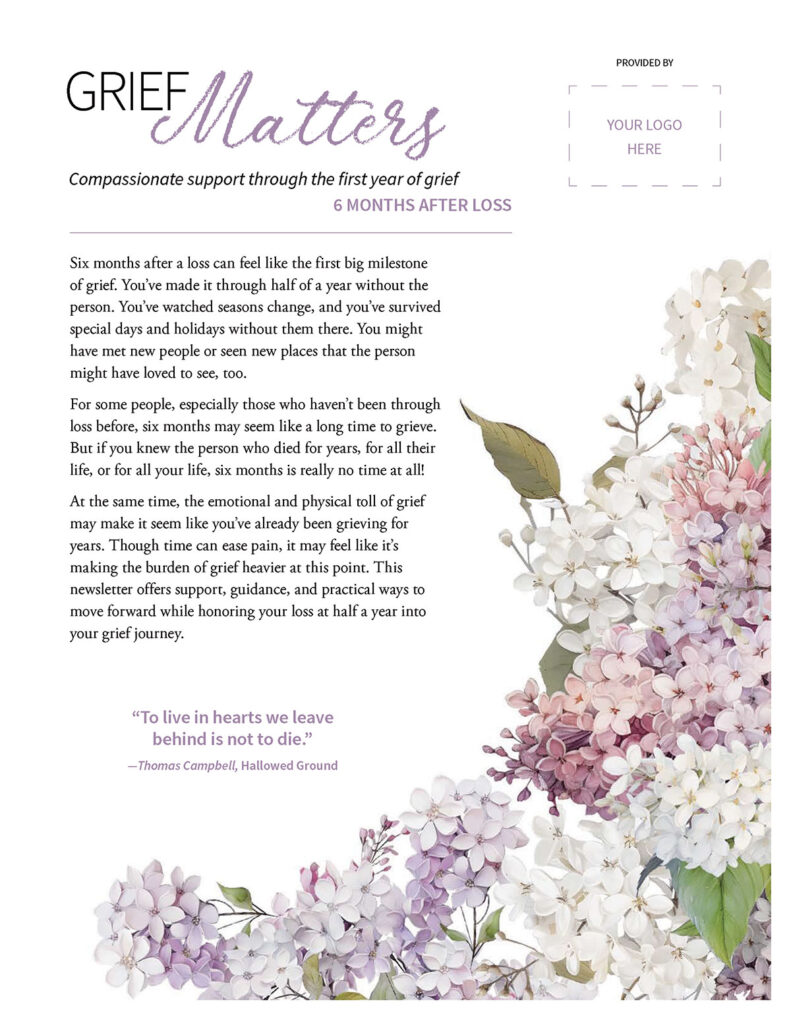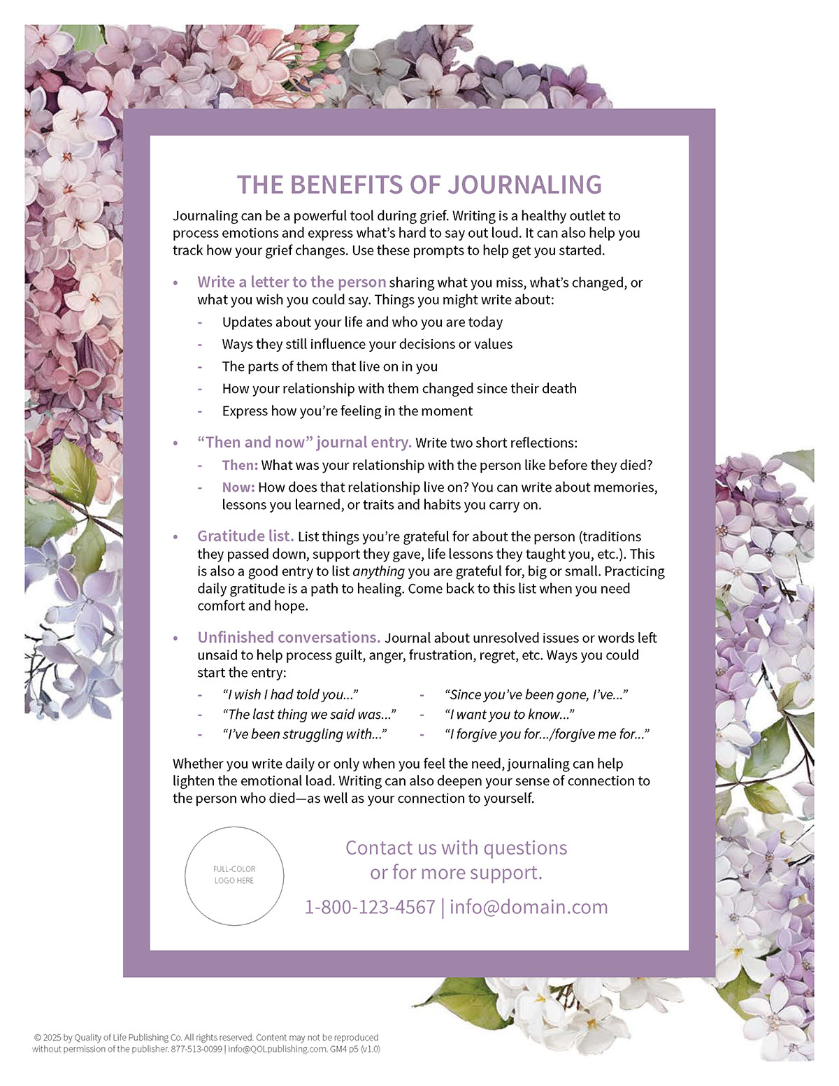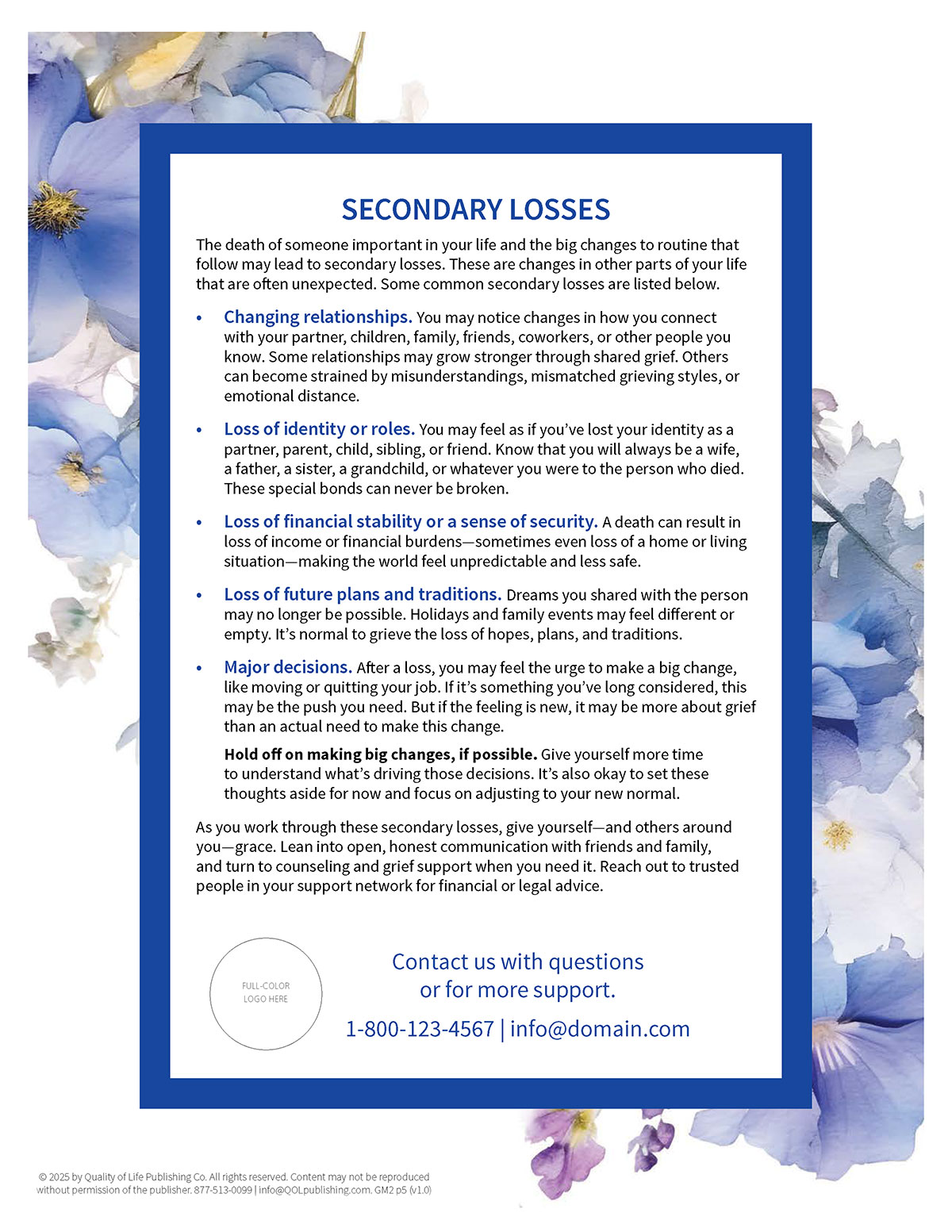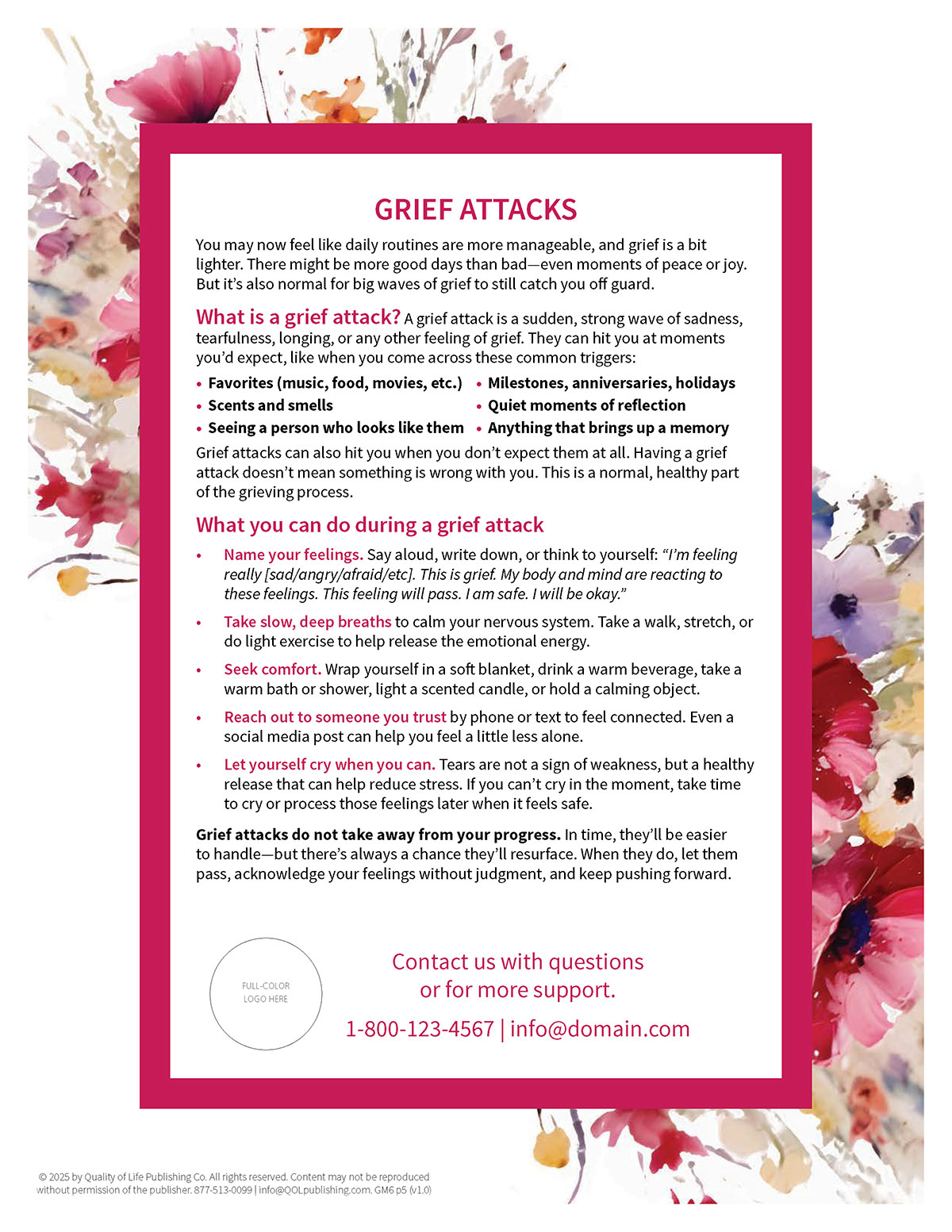 This 2-sided grief assessment sheet comes with every copy of the newsletter, branded with your logo, contact information, and spot color. Replace with your own assessment or opt out of receiving assessments by entering a note in Order Instructions or emailing us. |